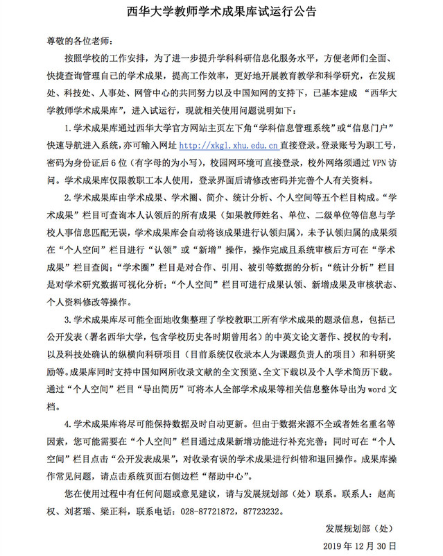 为了进一步提升学科科研信息化服务水平,方便老师们全面、快捷查询管理自己的学术成果,提高工作效率,更好地开展教育教学和科学研究,近日,在发规处、科技处、人事处、网管中心的共同努力以及中国知网的支持下,“伟德国际1949教师学术成果库”上线进入试运行阶段。