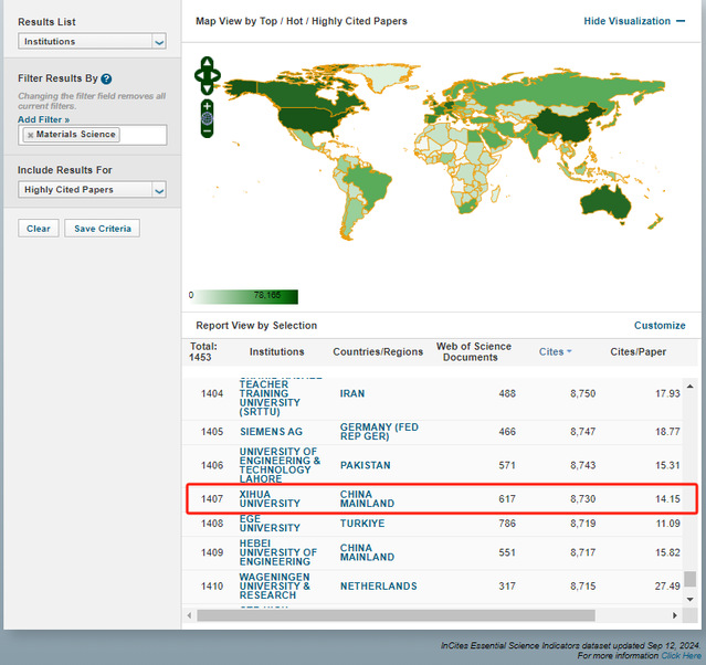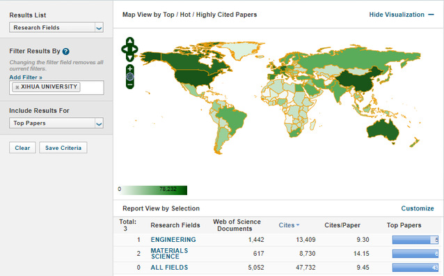最新ESI数据显示,我校近十年全部学科领域共发表纳入ESI统计论文5052篇,总被引用47732次,篇均被引9.45次,高影响力论文43篇。其中,材料科学领域共发表纳入ESI统计论文617篇,总被引用8730次,篇均被引14.15次,高影响力论文6篇。全球进入ESI前1%的机构共有9379个,我校位列3506位(在中国内地科研机构中名列第466位);全球进入材料科学ESI前1%的机构共有1453个,我校位列1407位(在中国内地科研机构中名列第329位)。