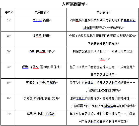 此次入库的案例涉及《合理安全用药指导下的药物设计、制备和质量控制案例分析》《建筑业转型升级与高质量发展下智能建造与创新管理》《美丽乡村宜居建设,地材资源合理定价——川藏地区地材资源分布及价格确定机制探索》等主题案例项目,入库案例的7个案例均具有时代性、引领性、学理性。下一步,学校将持续开展主题案例征集,鼓励专家学者扎根中国实践,讲好中国故事、传播中国声音,开发具有良好学术容量、高学理含量的高水平原创案例,为提高学校实践创新型人才培养质量作出更大贡献。