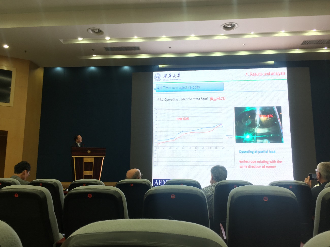会上,赖喜德教授作了题为《Experimental Investigation of Flows in a High-head Pump-turbine Draft tube using LDV》的特邀报告;我校特聘教授Gérard BOIS作了题为《A review of two phase flow analysis on centrifugal pump behavior and performance》的特邀报告;叶道星博士作了题为《Inner Flow Field PIV Measurement and Study on Turbulence Generator of Medium Consistency Pump》的报告;研究生代表卢昌燊、彭笙洋分别作了题为《The Working Conditions Optimization of Low-Head Water Turbine with Different Guide Vane Outlet Angle》《The Runner Structure Fluid Solid Coupling Research Of Bulb Tubular Turbine Based On The Cam Relationship》的分组报告。