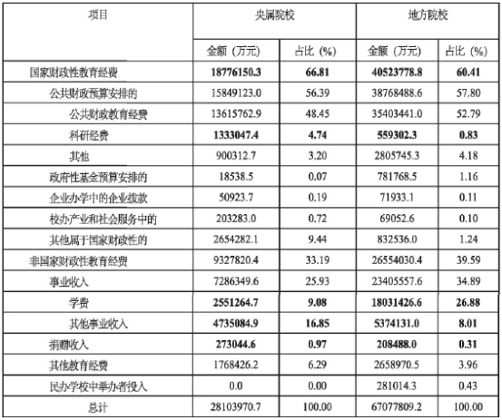 2 2015年央属院校与地方院校收入构成及其占比