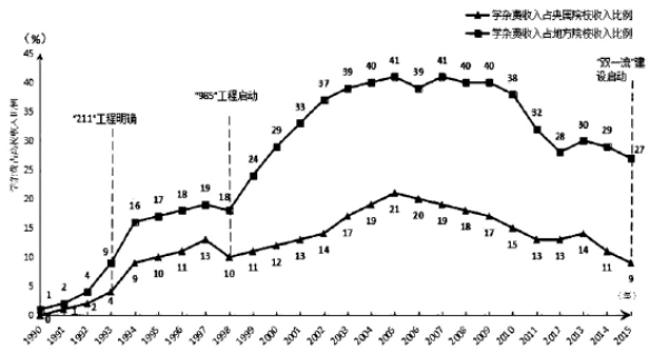 1 1990-2015 年学杂费收入占央属院校和地方院校收入的比例