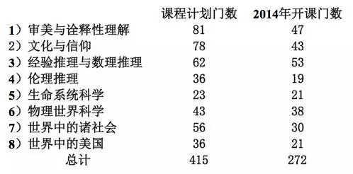 哈佛大学本科生毕业所需的32门课程分为专业课程、核心课程、任选课三类。其中专业课16门,任选课可以自由选择6到7门,但其中必须包含1门“说明文写作”以及1到2门语言类课程。剩下约7门即为通识教育课程。根据哈佛大学2014年的课程方案,通识教育课程的门类、数量以及实际开课数量如下表: