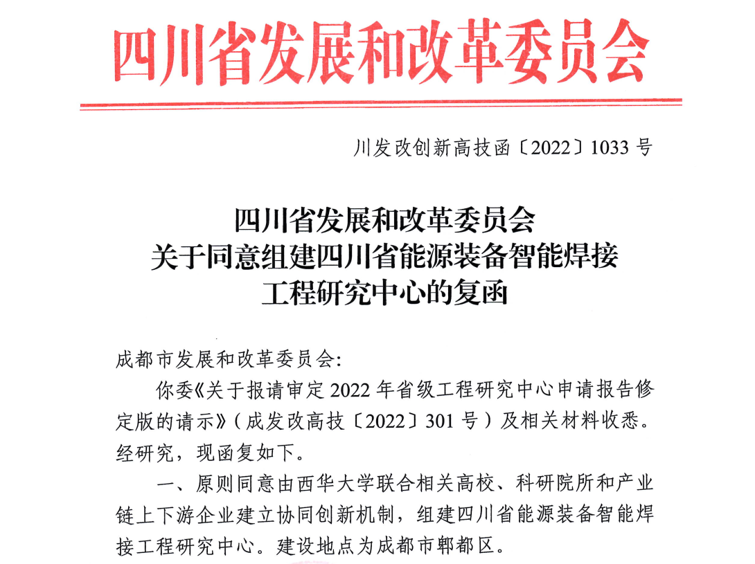 近日,根据《四川省发展和改革委员会关于同意组建四川省能源装备智能焊接工程研究中心的复函》(川发展创新高技函﹝2022﹞1033号),同意由伟德国际1949牵头,联合相关高校、科研院所和产业链上下游企业建立协同创新机制,组建四川省能源装备智能焊接工程研究中心。