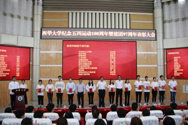 过去一年,共青团工作中涌现出许多先进集体和优秀个人,大会对其进行了表彰。校党委副书记王小林宣读了《伟德国际1949关于表彰2018-2019年度五四青年节先进集体和个人的决定》。人文学院团委等10个“五四红旗团委”、美术与设计学院团委等2个“共青团特色工作奖”,2017级材料成型及控制工程4支部等12个 “五四红旗团支部”、2016级思想政治教育1支部等120个“五四先进团支部”、张煜林等40名“西华青年五四奖章”、吴玉婕等488名“优秀共青团干部”、卢柳叶等970名“优秀共青团员”获得者受到学校表彰。校领导为获奖的集体和个人颁奖。